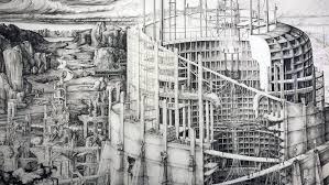 Er is een waanzinnige expositie te zien in Rijksmuseum Twente in Enschede. Van Carlijn Kingma, opgeleid tot architect maar gaandeweg steeds meer geïnteresseerd geraakt in de menselijke geschiedenis, de staat waarin wij verkeren, ons verleden en onze toekomst, ons lot. Met alleen de taal van de architect kon zij haar verhaal niet vertellen. Net zo min als zij haar verhalen kan vertellen gebaseerd enkel en alleen op haar eigen ideeën, fantasie, blik en kijk op de wereld. Zij noemt zichzelf cartograaf. Carlijn Kingma ging haar verhalen vertellen op basis van talloze gesprekken met denkers, schrijvers, dichters en wetenschappers en de weerslag daarvan is te vinden in ongelooflijk gedetailleerde tekeningen, telkens op basis van een zeker thema. In Enschede zagen we The Fabric of Humankind, Spolia of a Thousand Expectations, The Chronicle of Gaia, The Babylonian Tower of Modernity, Stargazers & Gravediggers, A History of the Utopian Tradition en The Objective Truth Factory.